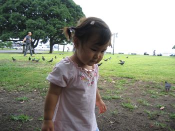 山下公園でハトとたわむれ〜
