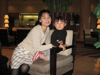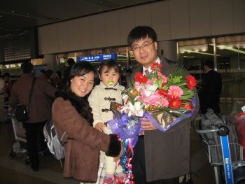 北京空港に到着し、花束でお出迎え。
