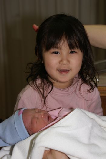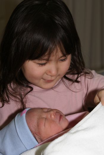 | 初めて抱っこ。ちょっと嬉しそうです。 | 3歳でも母性本能が有るんでしょうか? | |
