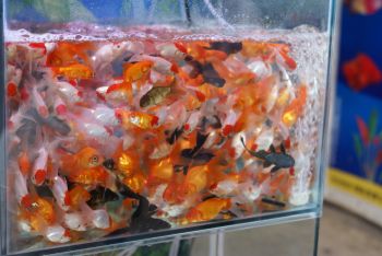 | 女人街にて。「まぁ、きれ〜」 | 金魚の大群に見とれていたのでした。 | |