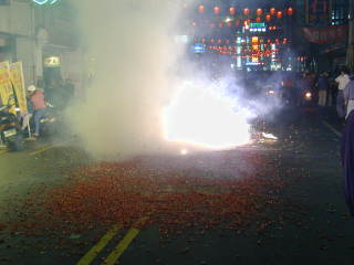 - 東寧宮の前では中国独特の巨大な爆竹が鳴り響きます。終わった後は爆竹の巻紙が赤い絨毯のように広がっていました。