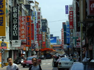- ここから放射状に延びる道がメインロードになっていますが、小さな店が建ち並び街中は看板だらけ。ほとんどは電飾(ネオン)です。休日の昼には道路の半分を通行止めにしてオレンジ色のビニールシートで屋根を作り、食堂が出来上がります。