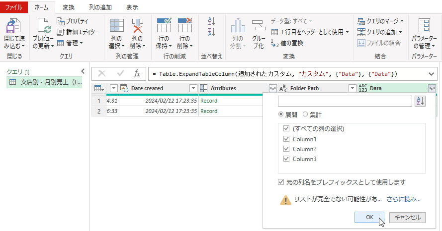 カスタム列に以下の式を入力する。他の手順はExcelファイルと同じ。