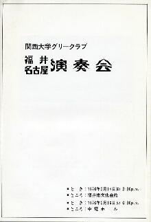 1976年3月14日、福井市文化会館での福井演奏会と1976年3月16日、中電ホールでの名古屋演奏会。津村信夫作詩、多田武彦作曲、男声合唱組曲「父のいる庭」と「ごめんやす グリークラブです! −グリーあれこれ−」と銘打ったステージと草野心平作詩、多田武彦作曲、「草野心平の詩から」を27期下井田秀明氏の指揮で演奏。福井の賛助出演はカーネル合唱団。萩原英彦女声合唱曲集より6曲を瓜生完二氏の指揮で演奏。名古屋の賛助出演は金城学院大学グリークラブ。童謡歌集より5曲を森田真紀氏の指揮で演奏。このページを書きながら調べたのですが、金城学院大学のHPのクラブ紹介にグリークラブは載っていませんでした。2000年までの活動はあったようなのですが? |