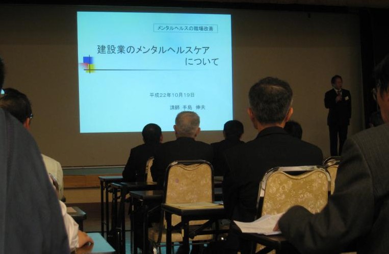 ![]() 巨大なスクリーンを使って説明 (スクリーンの前に立っているのが手島) |