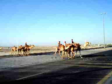 調教帰りのラクダとジョッキー達。キャメルレースのジョッキーは子供です。