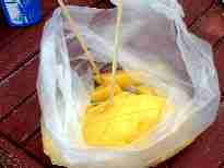 そして果物やのオバチャン。果物を剥く手つきは芸術的であります。剥いてくれたマンゴー。一番右はパレオ屋?