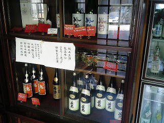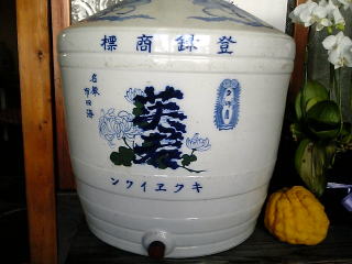 | 蔵玄関となりには直売所もあります | 事務所の玄関には陶器製のレトロな酒樽が・・ 2斗ほど入りそうな大きさでした |