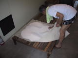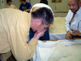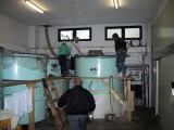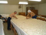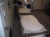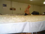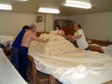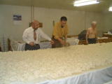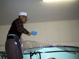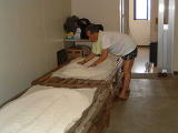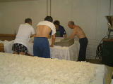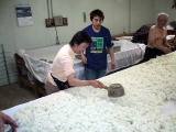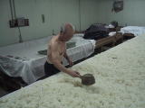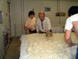 なんと、麹室へも案内していただきました。さすがに 中は暑く35℃を超えてました。蔵人は上半身裸で 汗かきながらの作業です 只今、米の温度を30℃くらいに下げています |