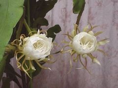 今年も見事な月下美人が咲きました。一晩咲いてすぐしぼんでしまう不思議な花です。1日目に四輪、2日目にも四輪花が咲きました。花はとても香りが良いのですが、強烈です。その匂いもたった一晩限りです。 特に二輪の花が咲いていくところを写真にとってみました。 |